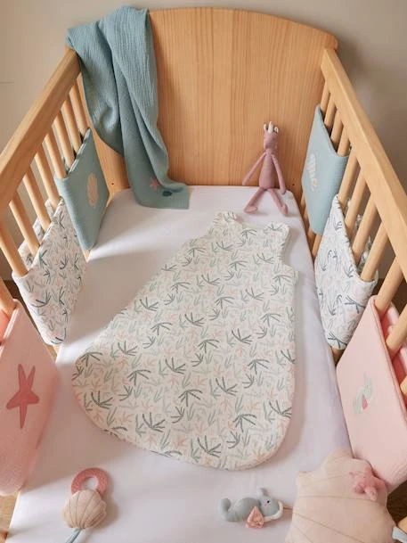 Côté parents, on apprécie de créer un joli petit nid douillet avec le tour de lit / tour de parc Sous l’Océan. Gaze de coton, jolis motifs, détails irisés : rien n’est trop beau pour votre bébé !